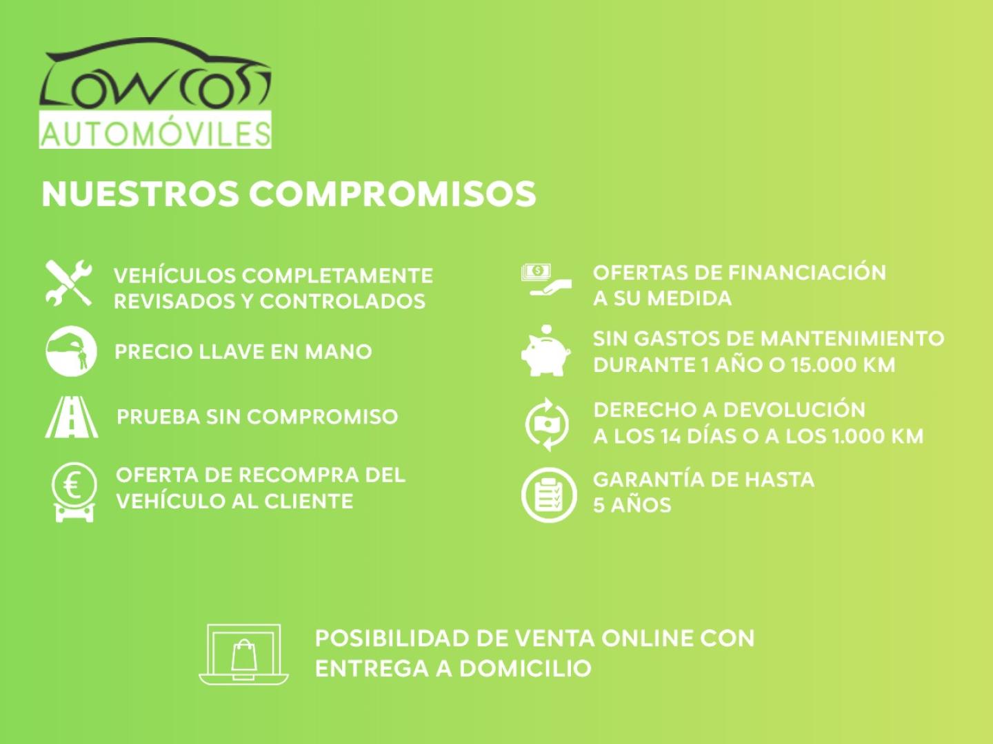 • Precio TODO INCLUIDO (salvo gastos de transferencia). • Revisión completa de 300 puntos de control. • 15 días de prueba o 1.000 km: si no estás satisfecho, ¡te lo cambiamos! • Financiación a medida hasta 96 meses. • Seguro personalizado: te damos la mejor cotización. • Aceptamos tu coche como parte de pago, con tasación inmediata. • Prueba del vehículo sin compromiso. • Certificado por escrito de kilometraje real y ausencia de daños estructurales. • ITV al día. • Envío de vídeos y fotos al momento.