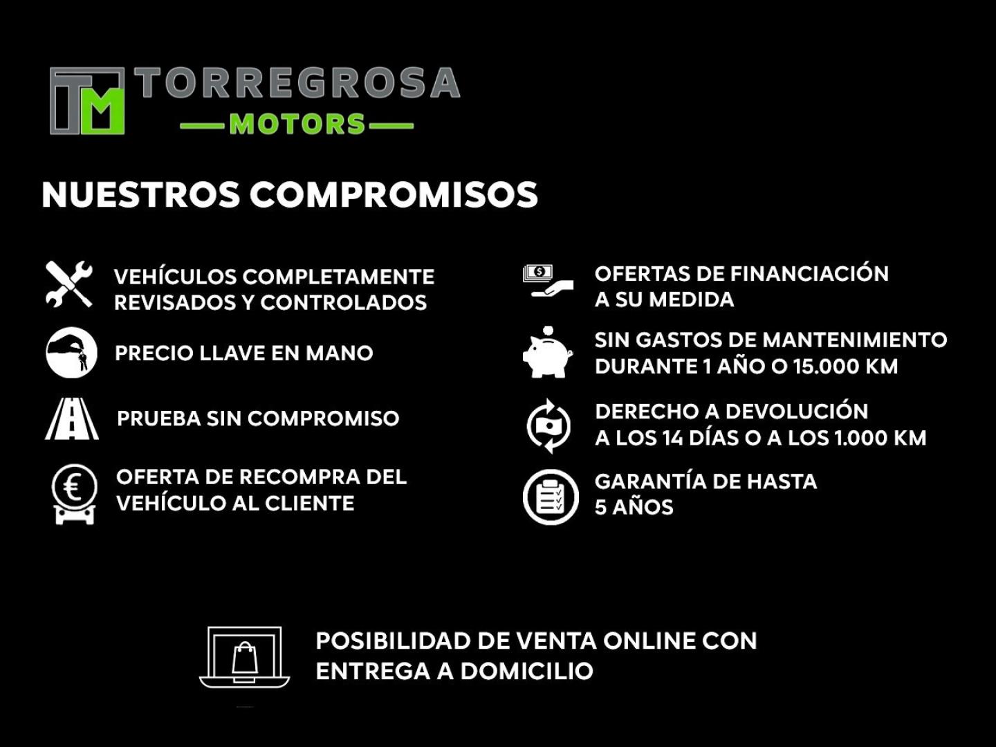 • Precio TODO INCLUIDO (salvo gastos de transferencia). • Revisión completa de 300 puntos de control. • 15 días de prueba o 1.000 km: si no estás satisfecho, ¡te lo cambiamos! • Financiación a medida hasta 96 meses. • Seguro personalizado: te damos la mejor cotización. • Aceptamos tu coche como parte de pago, con tasación inmediata. • Prueba del vehículo sin compromiso. • Certificado por escrito de kilometraje real y ausencia de daños estructurales. • ITV al día. • Envío de vídeos y fotos al momento.